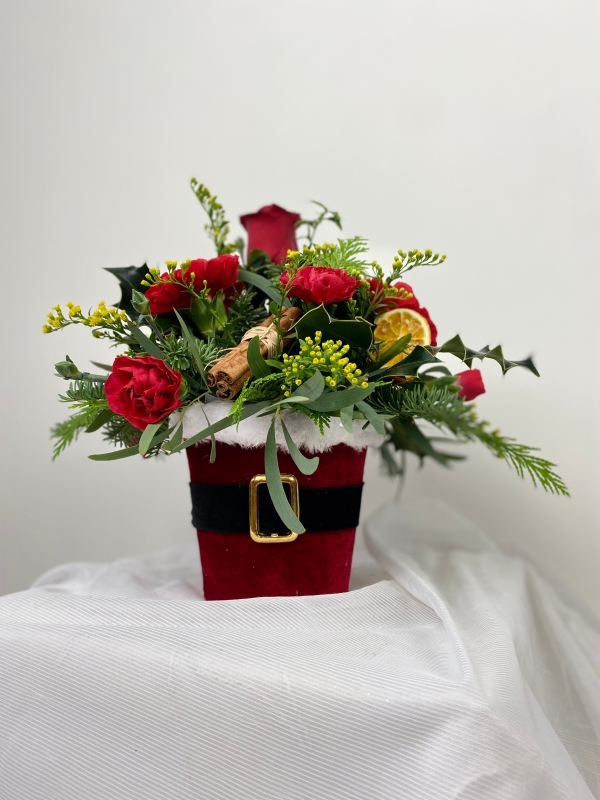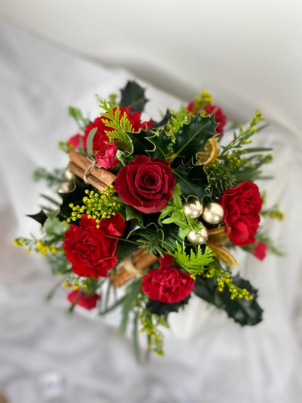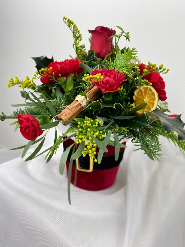 Our Florist have designed the Jingle Belt using scented Christmas foliages , a selection of red flowers with a hint of yellow ,extra scents of cinnamon and orange slices .