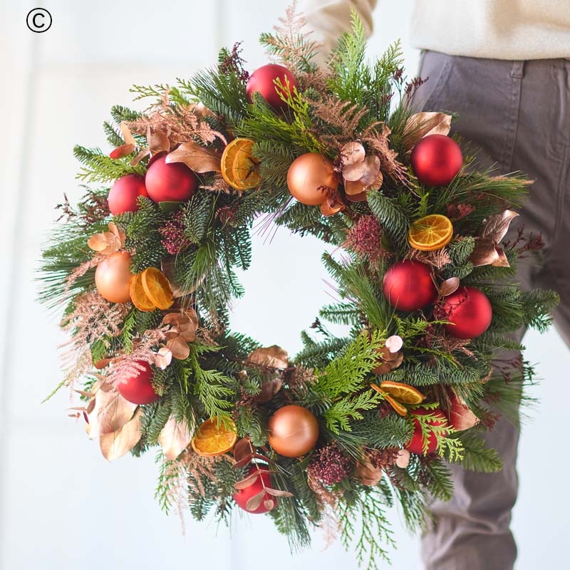 A classic Christmas wreath in iconic festive colours, including festive favourites. Rich reds, burgundies and greens. Pops of cream and peach. You might see pine cones, scented dried fruit, spruce and pine.