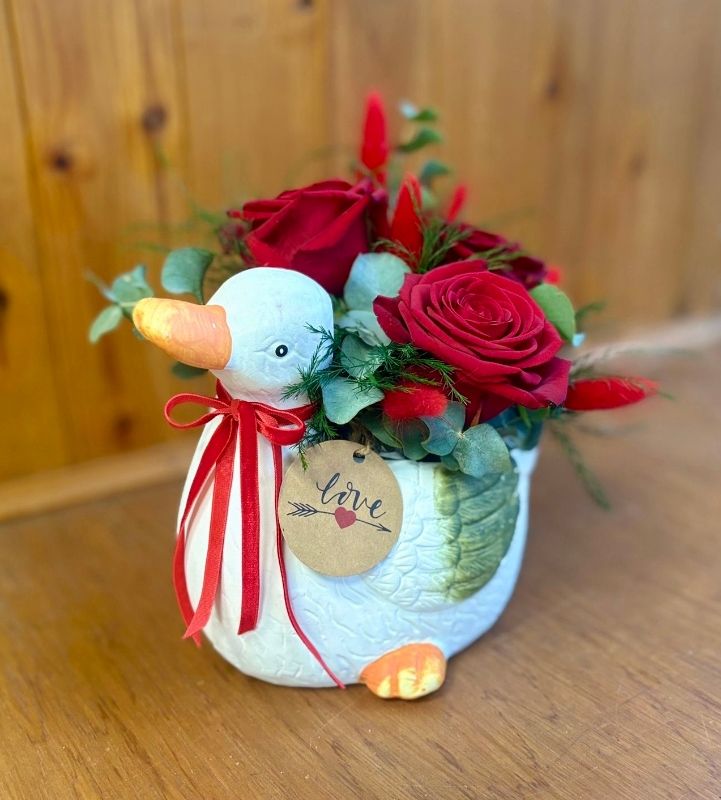 Designed to celebrate love with a touch of playful charm, this unique keepsake features luxurious red roses nestled into an adorable ceramic duck vase, finished with romantic ribbon and a heartfelt tag.