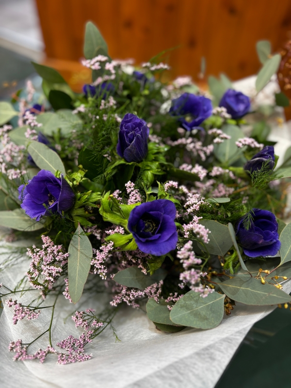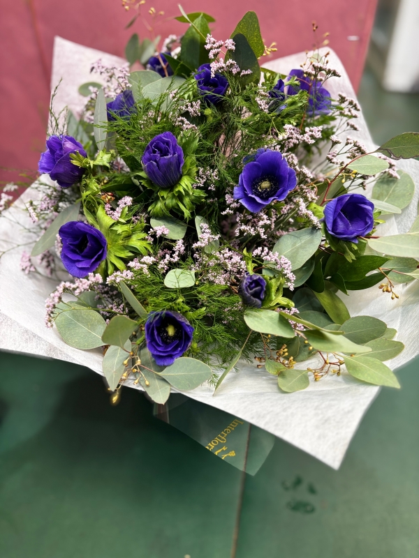 Delightfully velvet rich purple / blue seasonal Anemonies arranged with fresh foliages and delicate textures perfect for a gift or treating yourself .